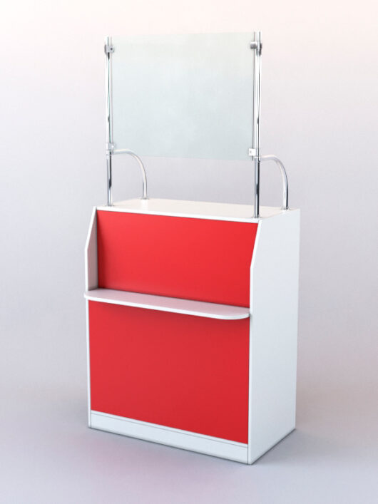 Конструкция прилавка представляет собой стойку со стеклянным фасадом. К столешнице прилавка на металлических трубах крепится стеклянная надставка. На передней панели расположена полка для сумок.