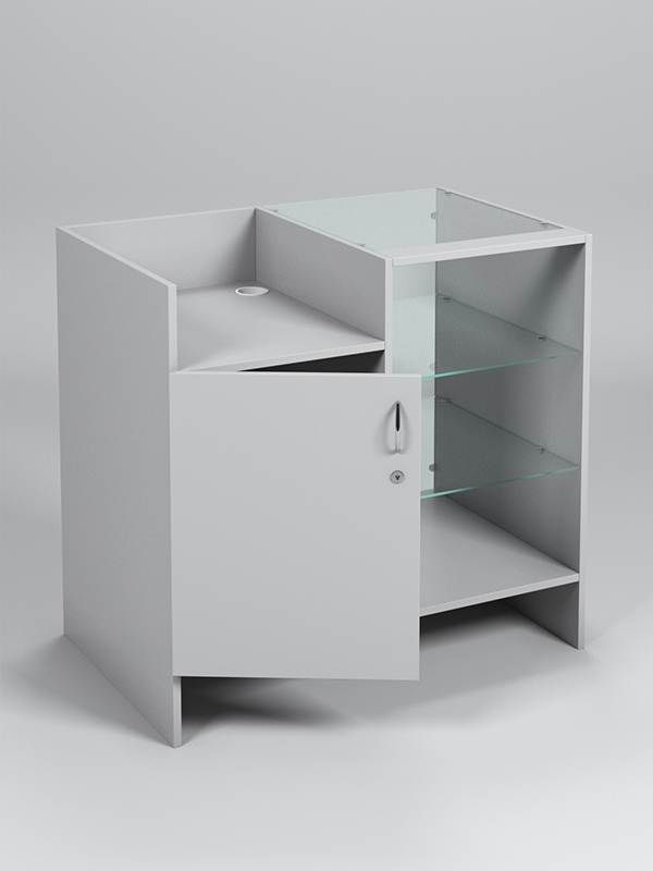 Прилавок предназначен для произведения расчетов с покупателями, состоит из двух секций: стеклянной с полками и глухой с дверкой. В глухой секции с левой стороны от продавца размещена ниша для расположения кассового аппарата.