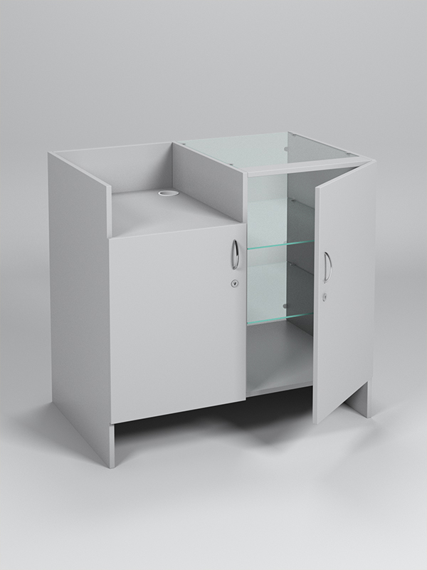 Прилавок предназначен для произведения расчетов с покупателями, состоит из двух секций: стеклянной с полками и глухой с нишей для расположения кассового аппарата. Прилавок также оснащен дверками из ЛДСП, которые закрываются на замок.