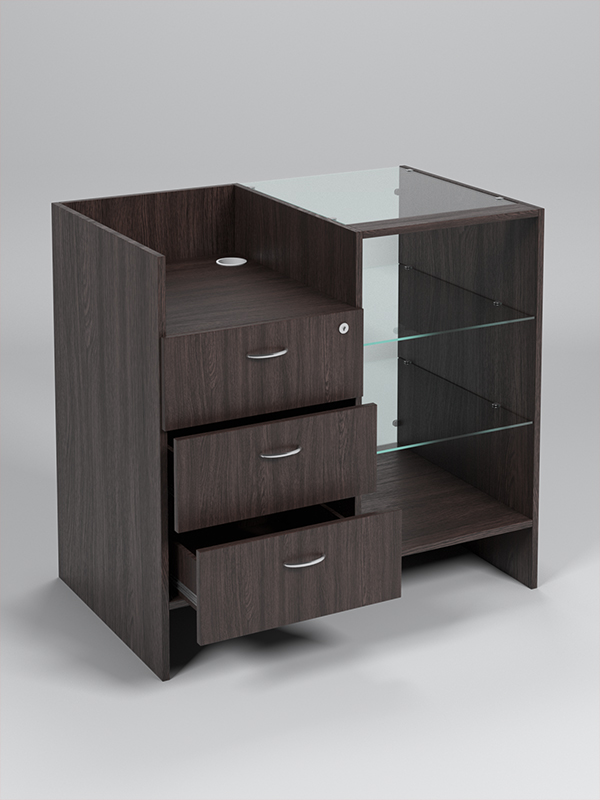 Прилавок предназначен для произведения расчетов с покупателями, состоит из двух секций: стеклянной с полками и глухой с нишей для расположения кассового аппарата. В глухой секции прилавка также располагаются три выдвижных ящика.
