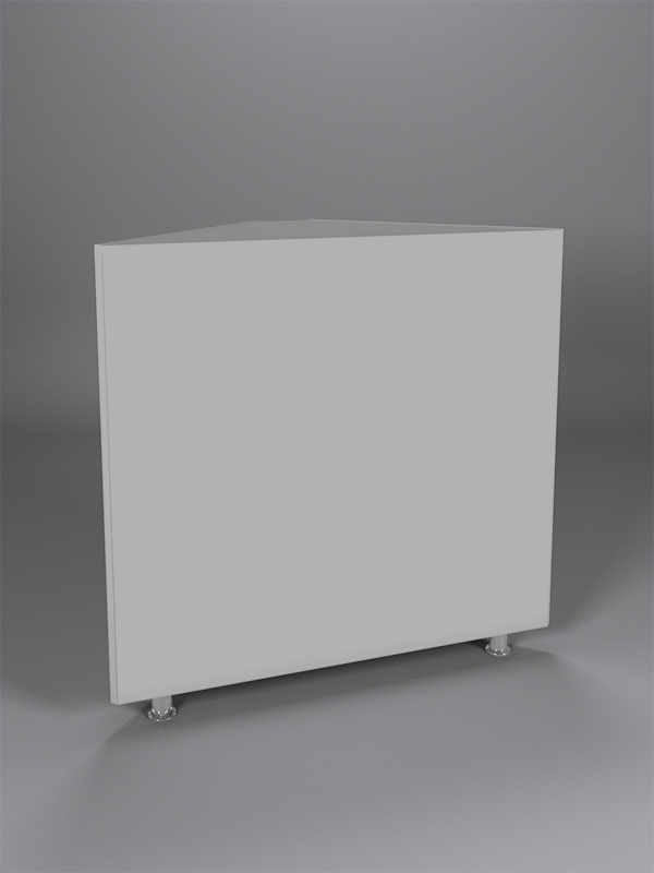 Прилавок имеет трапецевидную форму. Конструкция состоит из полки и накопителя. Корпус установлен на 4 металлические ножки. Каркас прилавка выполнен из ЛДСП. Спереди прилавок полностью закрытый.