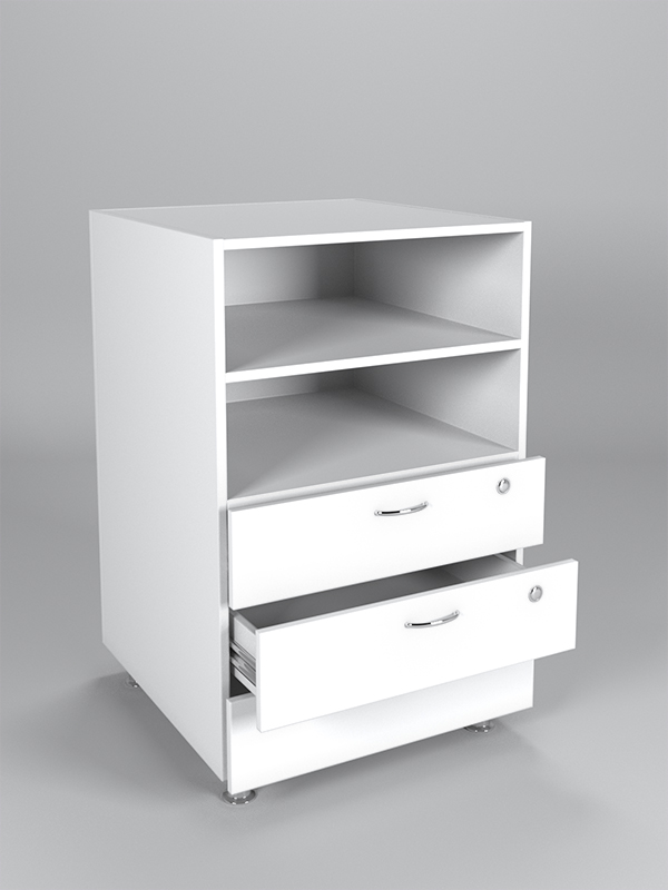 Прилавок состоит двух отделений и трех выдвижных ящиков. Ящики закрываются на ключ. Корпус установлен на 4 металлические ножки.