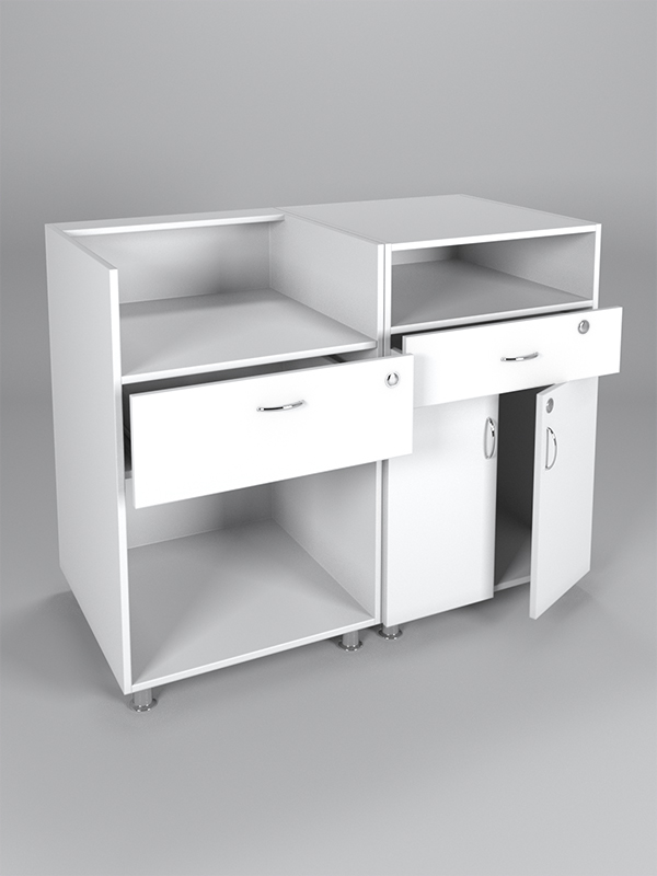 Комбинация моделей №1 и №7. Система состоит из прилавка с двумя нишами и ящиком и прилавка с нишей, ящиком и шкафом. Ящики закрываются на ключ.
