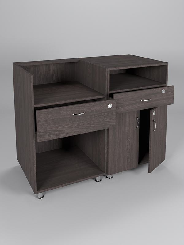 Комбинация моделей №1 и №8. Система состоит из прилавка с двумя нишами и ящиком и прилавка с нишей, полкой и тремя ящиками. Ящики закрываются на ключ.