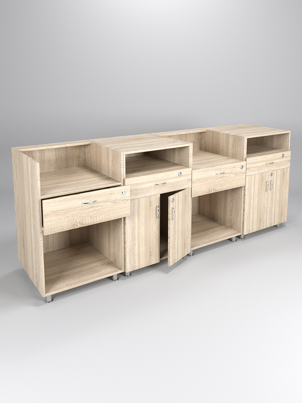 Комбинация моделей №1 и №7. Система состоит из четырех прилавков, чередующихся в таком порядке. Прилавок с нишами и ящиком, далее — прилавок с нишей, ящиком и шкафом. Ящики закрываются на ключ.