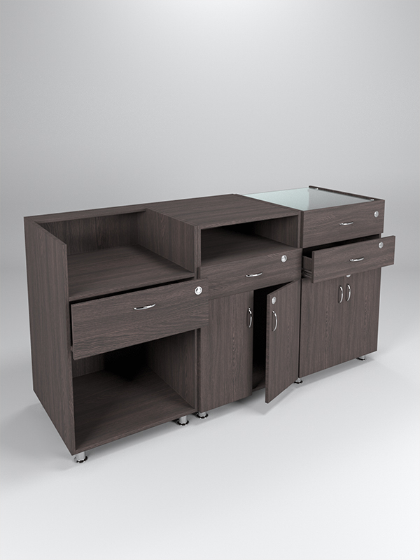 Комбинация моделей №1, №2 и №7. Система состоит из прилавка с нишами и ящиком, далее идет прилавок с нишей, ящиком и шкафом, за ним — прилавок с ящиком-витриной, ящиком и шкафом. Ящики закрываются на ключ.