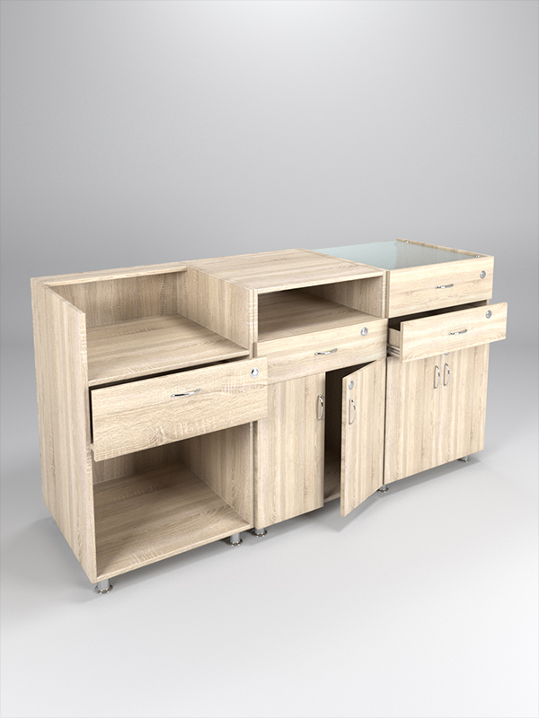 Комбинация моделей №1, №2 и №7. Система состоит из прилавка с нишами и ящиком, далее идет прилавок с нишей, ящиком и шкафом, за ним — прилавок с ящиком-витриной, ящиком и шкафом. Ящики закрываются на ключ.