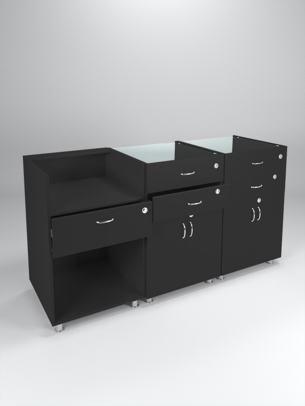 Имеется 5 ящиков под ключ и две глубокие полки с дверцами.