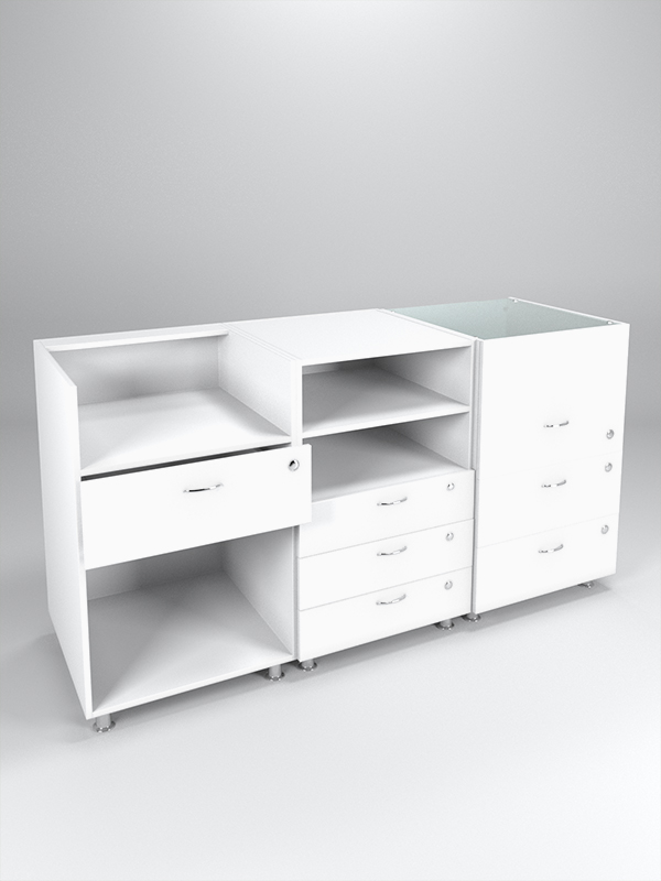 Комбинация моделей №1, №3 и №8. Система состоит из прилавка с нишами и ящиком, далее идет прилавок с нишей, полкой и тремя ящиками, за ним — прилавок с витриной и двумя ящиками. Ящик-витрина — трехъярусный. Все ящики закрываются на ключ.