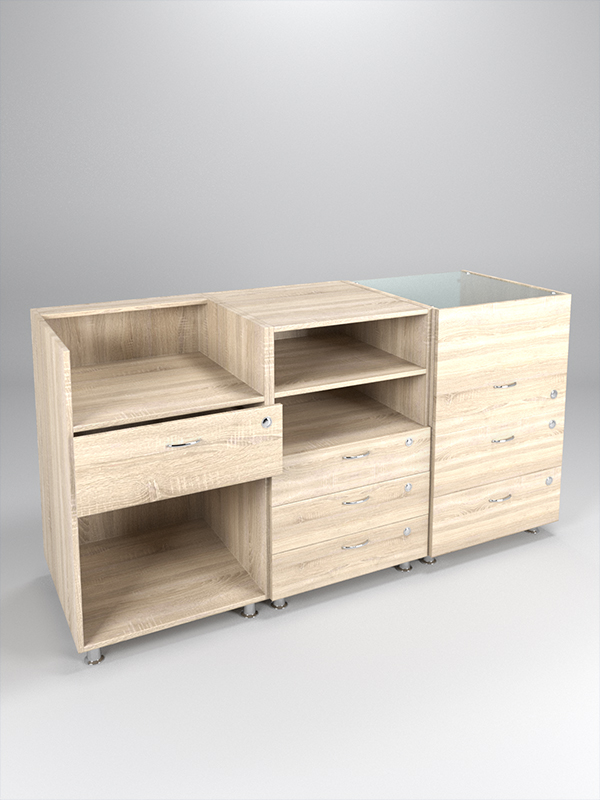 Комбинация моделей №1, №3 и №8. Система состоит из прилавка с нишами и ящиком, далее идет прилавок с нишей, полкой и тремя ящиками, за ним — прилавок с витриной и двумя ящиками. Ящик-витрина — трехъярусный. Все ящики закрываются на ключ.