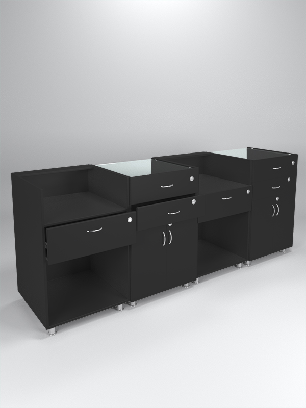 Комбинация моделей №1 и №3. Система состоит из четырех прилавков, чередующихся в таком порядке. Прилавок с нишами и ящиком, далее — прилавок с ящиком-витриной, ящиком и шкафом. Все ящики закрываются на ключ.