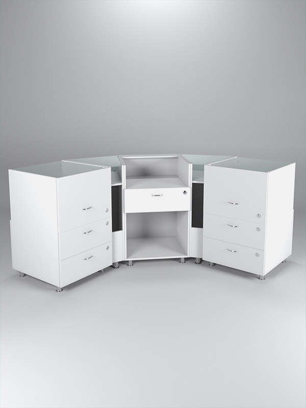 Комбинация моделей №1, №3 и №6. Система состоит из пяти прилавков. Прилавки объединены в таком порядке. В центре — прилавок с нишами и ящиком, слева и справа расположены угловые прилавки с витриной и нишей, далее — прилавки с трехъярусной витриной и ящиками. Все ящики закрываются на ключ.