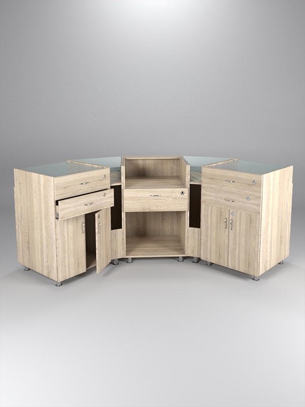 Комбинация моделей №1, №2 и №6. Система состоит из пяти прилавков. Прилавки объединены в таком порядке. В центре — прилавок с нишами и ящиком, слева и справа расположены угловые прилавки с витриной и нишей, далее — прилавки с витриной, ящиком и шкафом. Все ящики закрываются на ключ.