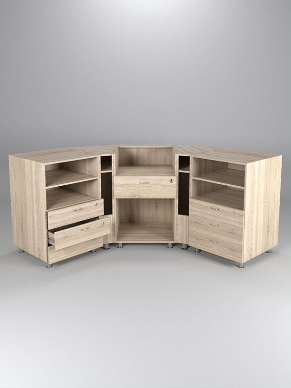 Комбинация моделей №1, №8 и №9. Система состоит из пяти прилавков. Прилавки объединены в таком порядке. В центре — прилавок с нишами и ящиком, слева и справа расположены угловые прилавки с полкой и нишей, далее — прилавки с нишей, полкой и ящиками. Все ящики закрываются на ключ.