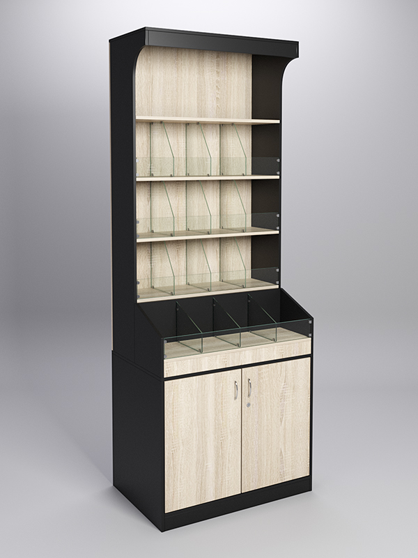 Верхняя граница стеллажа завершается крышей. Внизу располагается накопитель с распашными дверками и замком.