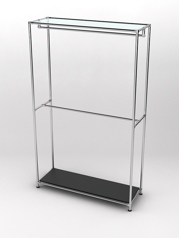 Данная модель состоит из двух уровней, на каждом из которых располагается штанга для плечиков. В основании находится полка из ДСП, которую удобно использовать для размещения обуви и аксессуаров. Наверху расположена стеклянная полка, предназначенная для головных уборов. При равномерном распределении вещей нагрузка на стекло составляет 5-7кг.