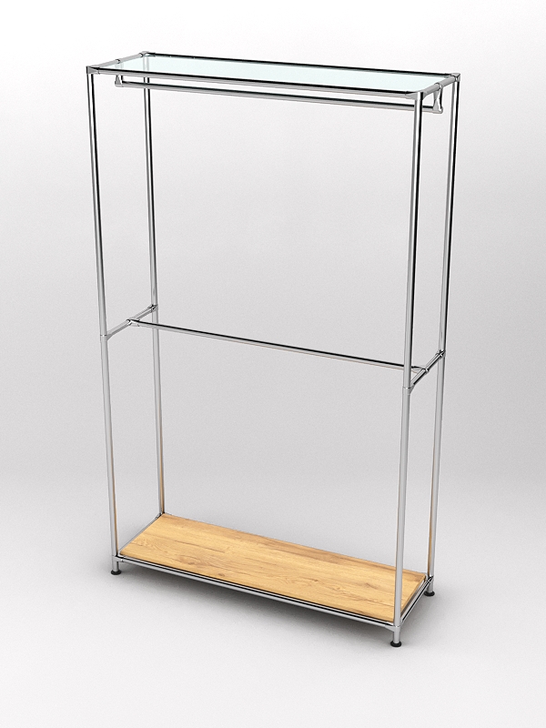 Данная модель состоит из двух уровней, на каждом из которых располагается штанга для плечиков. В основании находится полка из ДСП, которую удобно использовать для размещения обуви и аксессуаров. Наверху расположена стеклянная полка, предназначенная для головных уборов. При равномерном распределении вещей нагрузка на стекло составляет 5-7кг.