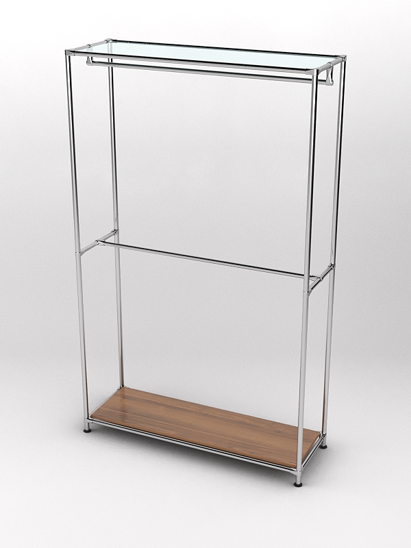 Данная модель состоит из двух уровней, на каждом из которых располагается штанга для плечиков. В основании находится полка из ДСП, которую удобно использовать для размещения обуви и аксессуаров. Наверху расположена стеклянная полка, предназначенная для головных уборов. При равномерном распределении вещей нагрузка на стекло составляет 5-7кг.