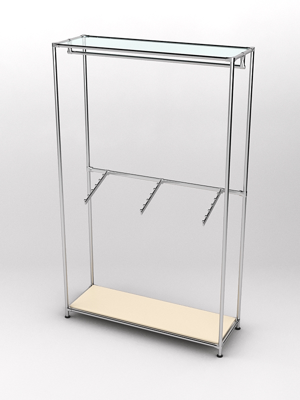 Данная модель состоит из двух уровней, на каждом из которых располагается штанга для плечиков. В основании находится полка из ДСП, которую удобно использовать для размещения обуви и аксессуаров. Наверху расположена стеклянная полка, предназначенная для головных уборов. При равномерном распределении вещей нагрузка на стекло составляет 5-7кг.