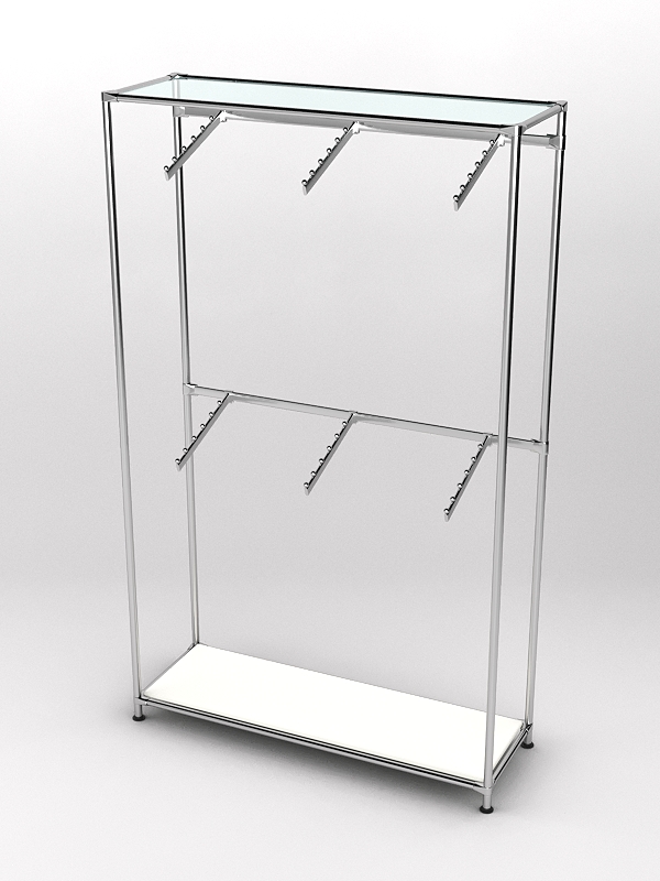 Данная модель состоит из двух уровней, на каждом из которых располагается штанга с кронштейнами для плечиков. В основании находится полка из ДСП, которую удобно использовать для размещения обуви и аксессуаров. Наверху расположена стеклянная полка, предназначенная для головных уборов. При равномерном распределении вещей нагрузка на стекло составляет 5-7кг.