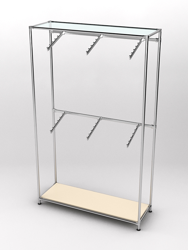 Данная модель состоит из двух уровней, на каждом из которых располагается штанга с кронштейнами для плечиков. В основании находится полка из ДСП, которую удобно использовать для размещения обуви и аксессуаров. Наверху расположена стеклянная полка, предназначенная для головных уборов. При равномерном распределении вещей нагрузка на стекло составляет 5-7кг.