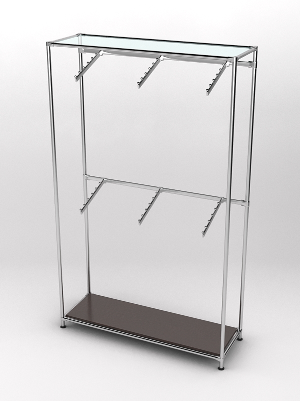 Данная модель состоит из двух уровней, на каждом из которых располагается штанга с кронштейнами для плечиков. В основании находится полка из ДСП, которую удобно использовать для размещения обуви и аксессуаров. Наверху расположена стеклянная полка, предназначенная для головных уборов. При равномерном распределении вещей нагрузка на стекло составляет 5-7кг.