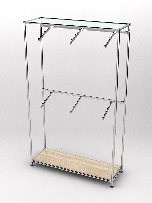 Данная модель состоит из двух уровней, на каждом из которых располагается штанга с кронштейнами для плечиков. В основании находится полка из ДСП, которую удобно использовать для размещения обуви и аксессуаров. Наверху расположена стеклянная полка, предназначенная для головных уборов. При равномерном распределении вещей нагрузка на стекло составляет 5-7кг.