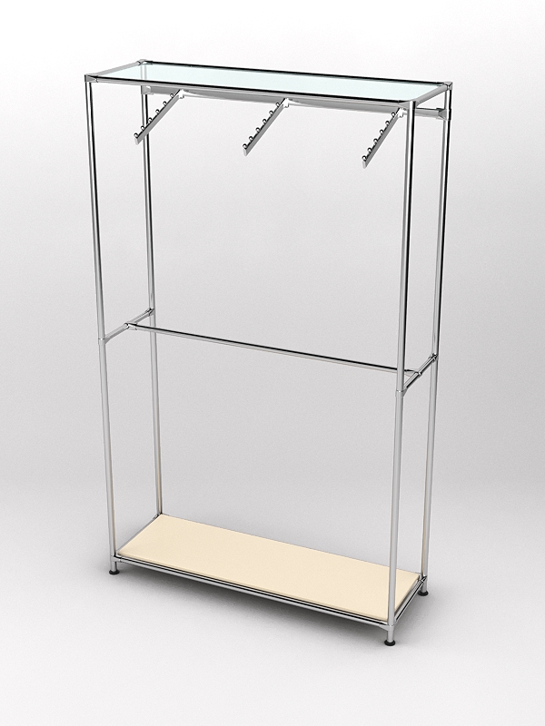 Данная модель состоит из двух уровней, на одном из которых располагаются кронштейны для плечиков а на втором штанга. В основании находится полка из ДСП, которую удобно использовать для размещения обуви и аксессуаров. Наверху расположена стеклянная полка, предназначенная для головных уборов. При равномерном распределении вещей нагрузка на стекло составляет 5-7кг.