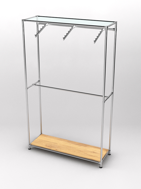 Данная модель состоит из двух уровней, на одном из которых располагаются кронштейны для плечиков а на втором штанга. В основании находится полка из ДСП, которую удобно использовать для размещения обуви и аксессуаров. Наверху расположена стеклянная полка, предназначенная для головных уборов. При равномерном распределении вещей нагрузка на стекло составляет 5-7кг.