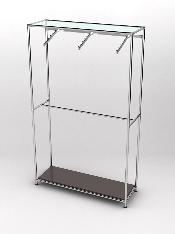 Данная модель состоит из двух уровней, на одном из которых располагаются кронштейны для плечиков а на втором штанга. В основании находится полка из ДСП, которую удобно использовать для размещения обуви и аксессуаров. Наверху расположена стеклянная полка, предназначенная для головных уборов. При равномерном распределении вещей нагрузка на стекло составляет 5-7кг.