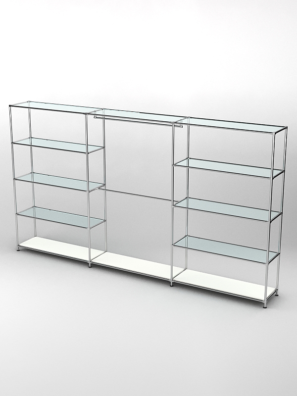 Каркас из металла. Основание деревянное. Три секции. Каждая боковая секция имеет четыре полки для вещей, средние полки стеклянные. В средней секции в два ряда расположены перекладины для плечиков.