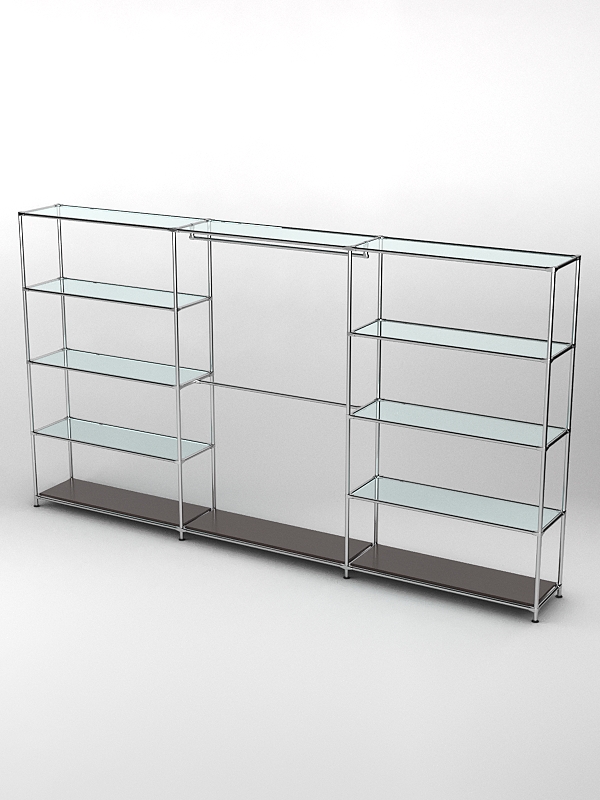 Каркас из металла. Основание деревянное. Три секции. Каждая боковая секция имеет четыре полки для вещей, средние полки стеклянные. В средней секции в два ряда расположены перекладины для плечиков.