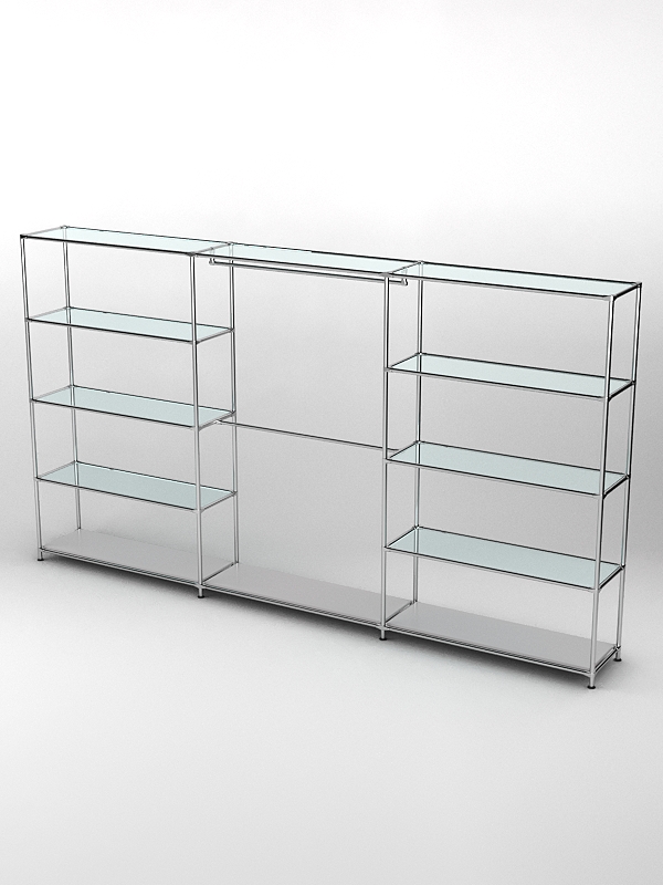 Каркас из металла. Основание деревянное. Три секции. Каждая боковая секция имеет четыре полки для вещей, средние полки стеклянные. В средней секции в два ряда расположены перекладины для плечиков.