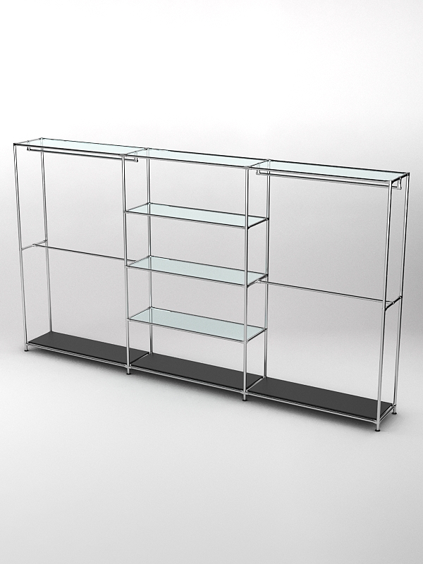 Каркас из металла. Основание деревянное. Три секции. В боковых секциях в два ряда расположены перекладины для плечиков. В центральной секции находятся четыре полки для вещей и аксессуаров. Средние полки стеклянные.