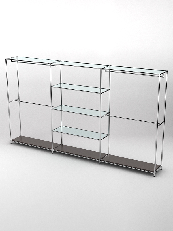 Каркас из металла. Основание деревянное. Три секции. В боковых секциях в два ряда расположены перекладины для плечиков. В центральной секции находятся четыре полки для вещей и аксессуаров. Средние полки стеклянные.