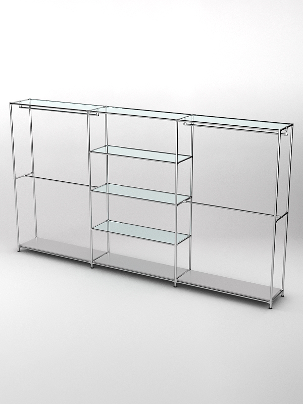 Каркас из металла. Основание деревянное. Три секции. В боковых секциях в два ряда расположены перекладины для плечиков. В центральной секции находятся четыре полки для вещей и аксессуаров. Средние полки стеклянные.