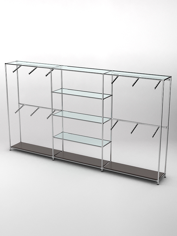 Каркас из металла. Основание деревянное. Три секции. Боковые секции оснащены поперечными планками для плечиков, по четыре планки в каждой секции. Четыре полки центральной секции служат для размещения аксессуаров. Средние полки стеклянные.