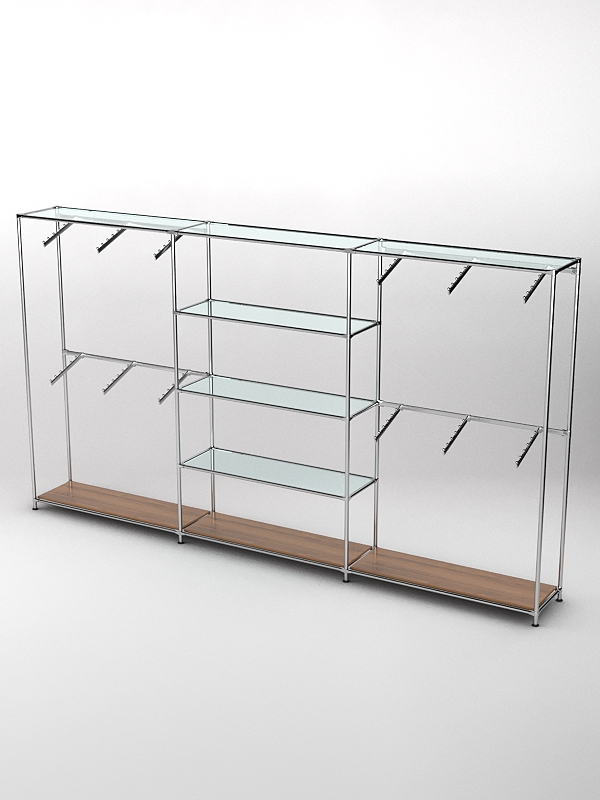 Каркас из металла. Основание деревянное. Три секции. Боковые секции оснащены поперечными планками для плечиков, по четыре планки в каждой секции. Четыре полки центральной секции служат для размещения аксессуаров. Средние полки стеклянные.