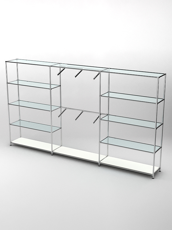 Каркас из металла. Основание деревянное. Три секции. Каждая боковая секция оснащена четырьмя полками для сумок и других аксессуаров. Средние полки стеклянные, нижние деревянные. Центральная часть предназначена под гардероб. Четыре поперечные планки для плечиков позволяют продемонстрировать различные виды одежды.