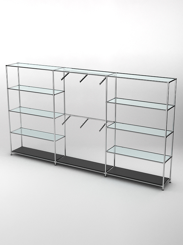 Каркас из металла. Основание деревянное. Три секции. Каждая боковая секция оснащена четырьмя полками для сумок и других аксессуаров. Средние полки стеклянные, нижние деревянные. Центральная часть предназначена под гардероб. Четыре поперечные планки для плечиков позволяют продемонстрировать различные виды одежды.