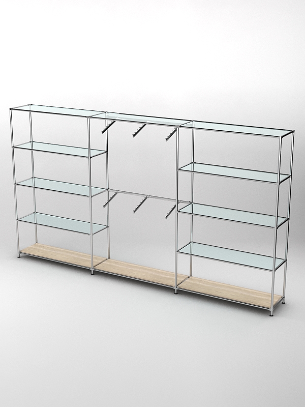 Каркас из металла. Основание деревянное. Три секции. Каждая боковая секция оснащена четырьмя полками для сумок и других аксессуаров. Средние полки стеклянные, нижние деревянные. Центральная часть предназначена под гардероб. Четыре поперечные планки для плечиков позволяют продемонстрировать различные виды одежды.