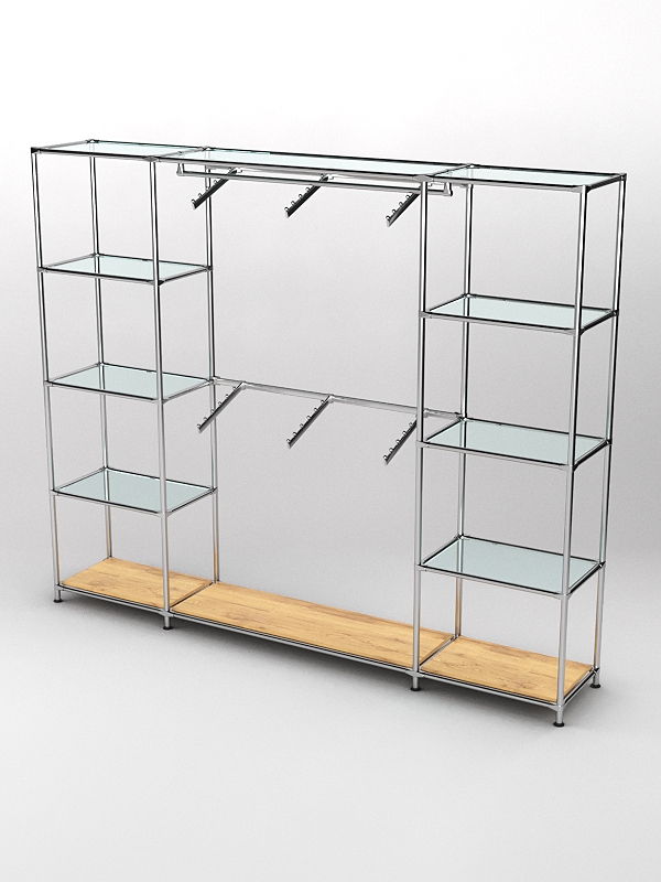 Каркас из металла. Основание деревянное. Три секции. Боковые секции оснащены полками для сумок и других аксессуаров. В каждой секции три стеклянные полки и одна деревянная. В центральной секции четыре поперечные планки для плечиков.