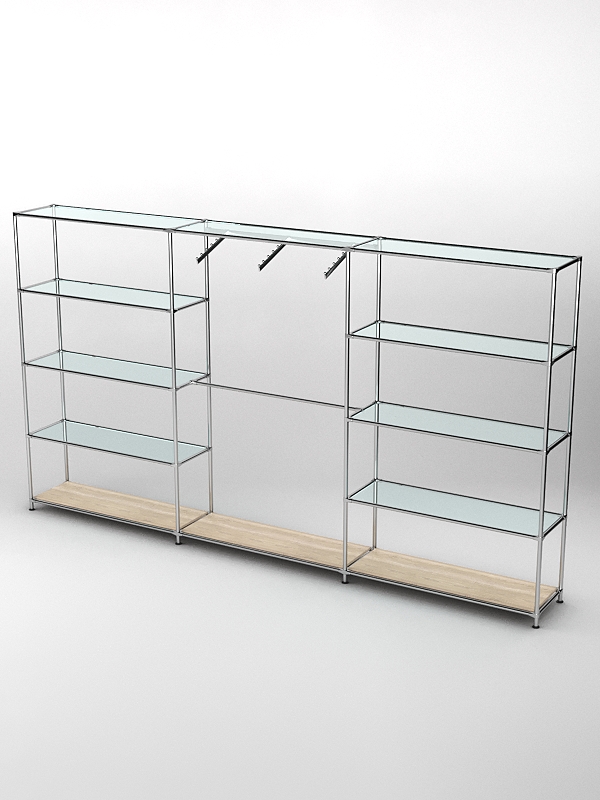 Каркас из металла. Крыша стеклянная, основание деревянное. Три секции. Четыре полки боковых секций служат для размещения сумок и других аксессуаров. Средние полки стеклянные, нижние — деревянные. Центральная секция оснащена перекладиной и планками для плечиков.