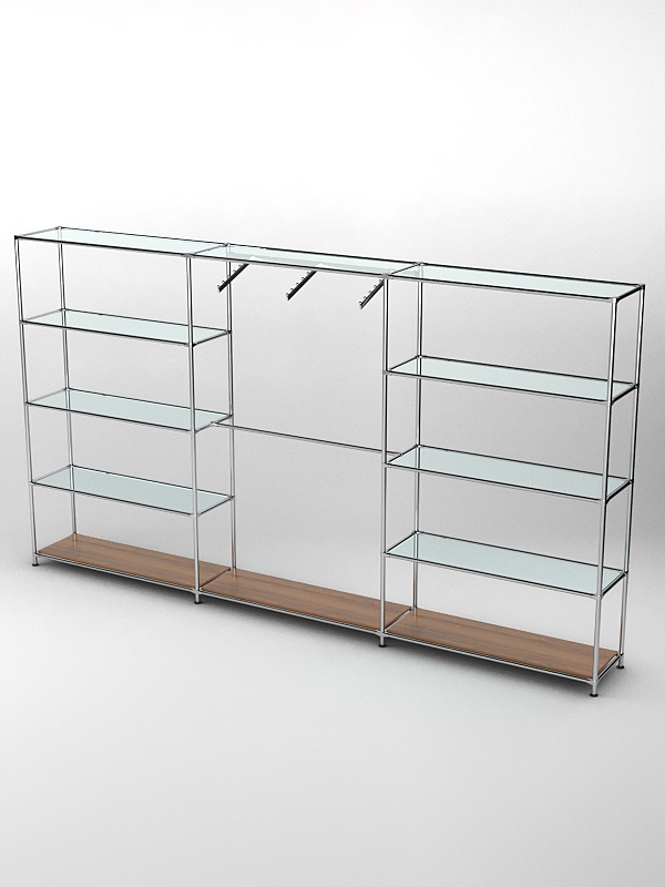 Каркас из металла. Крыша стеклянная, основание деревянное. Три секции. Четыре полки боковых секций служат для размещения сумок и других аксессуаров. Средние полки стеклянные, нижние — деревянные. Центральная секция оснащена перекладиной и планками для плечиков.