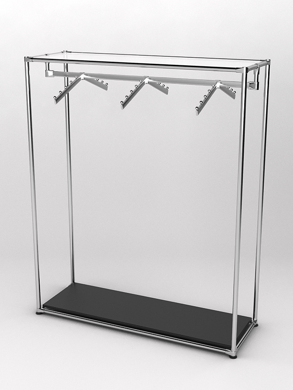 Торговый стенд — недорогой и эффективный способ продемонстрировать одежду, обувь и аксессуары в магазине одежды или в брендовом бутике. Система имеет металлический каркас на основе джокерной трубы. В верхней части находится штанга с четырьмя кронштейнами, расположенными по два с каждой стороны. Верхняя платформа — зеркало. Нижняя платформа выполнена из ДСП. Цвет подбирается в вариантах стандарт и на заказ. Равномерная нагрузка на штангу 10-12кг. Выносные кронштейны на трубу квадрат не входят в стоимость системы.