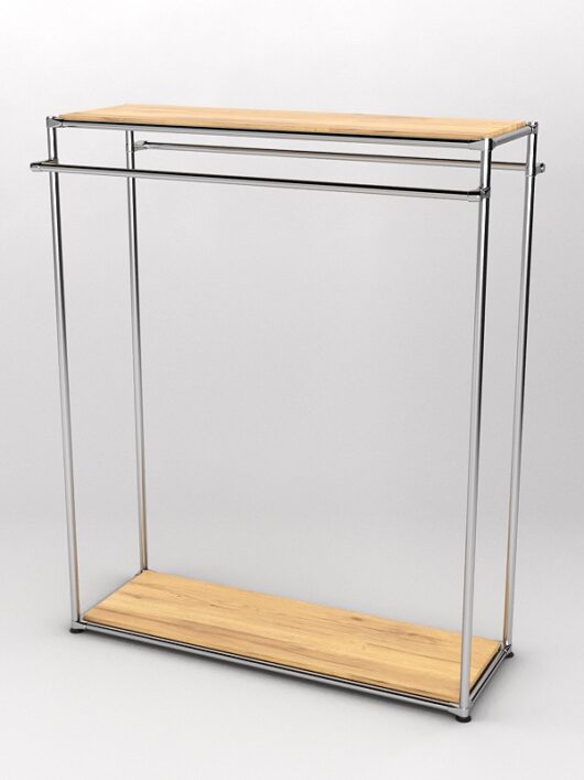Каркас выполнен из хромированного металла. По обе стороны стойки расположены штанги для плечиков. Цоколь и крыша изготовлены из ЛДСП. Цоколь выполняет функцию обувной полки, крыша — функцию полки для аксессуаров.