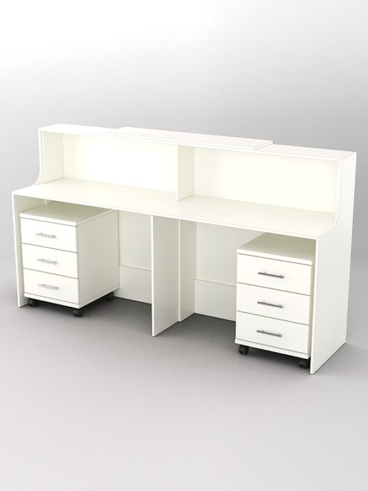 Ресепшен — это то, что входящий в помещение клиент видит в первую очередь. Не будет лишним сразу привлечь внимание клиента, чтобы ему было приятнее у Вас находиться. Ресепшн №10 имеет оригинальный дизайн, подойдет для двух администраторов, он миниатюрный, имеет у каждого столика по три ящика, верхние из которых сделаны под ключ.
