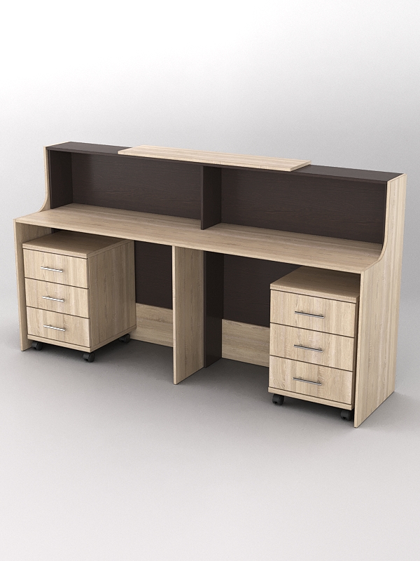 Ресепшен — это то, что входящий в помещение клиент видит в первую очередь. Не будет лишним сразу привлечь внимание клиента, чтобы ему было приятнее у Вас находиться. Ресепшн №10 имеет оригинальный дизайн, подойдет для двух администраторов, он миниатюрный, имеет у каждого столика по три ящика, верхние из которых сделаны под ключ.