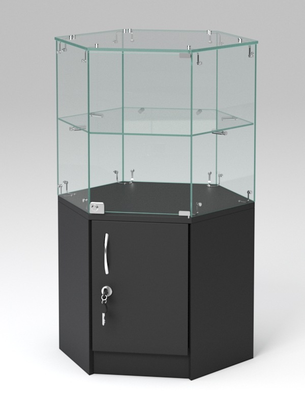 Прилавки данной серии выполнены в форме шестигранника, чем, несомненно, привлекают внимание. Контрастные по цвету панели из ЛДСП, кристально прозрачные витрины, блестящая фурнитура — все это выглядит элегантно и стильно. Прилавки могут сочетаться в любых комбинациях и в любом количестве. Нагрузка на стеклянные полки — 5-7кг при равномерном распределении предметов.