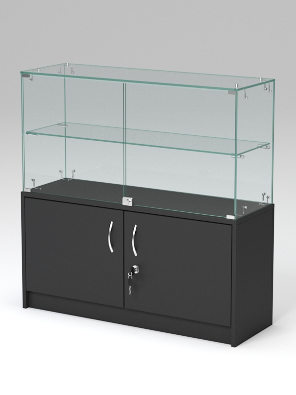 Форма прилавка — прямоугольная. Конструкция включает витрину с полкой и накопитель. Витрина и накопитель оборудованы распашными дверями с замком. Основной цвет — черный, дополнительный — белый.